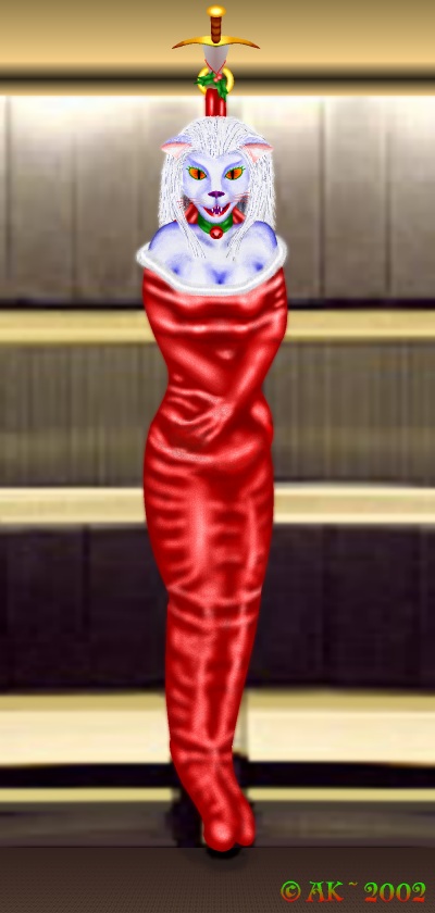 Alqua Kalina did this cheesy-cake picture after hearing about events in the USS Freedom sim in August 2002. K'Lynxyl and Lera had gotten kidnapped by the Ferrengi, but not before Lera had gotten sloshed with water from the springs of Planet Junkeskyo (sp).